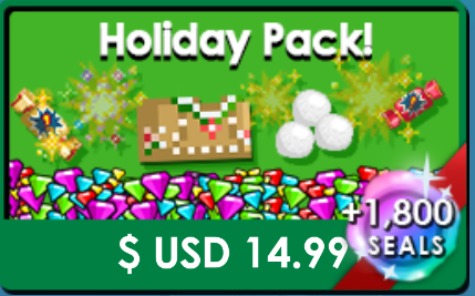 The '''Holiday Pack''' earns you 450,000 [[Gems]], 2 [[Deluxe Winterfest Cracker]]s, 25 [[Winterfest Cracker]]s, 5 [[Snowball]]s, 1 [[Gingerbread Sweater]], and 1,800 [[Royal Winter Seal]]s for the price of 14.99 USD. Only available during [[WinterFest]]. | |||