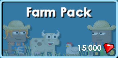 {{RecipeStore|[[Farm Pack]]|15,000|G|Put the Grow in Growtopia with this pack, including a Cow you can milk, a Chicken that lays eggs, 10 Wheat, 10 Barn Blocks, 10 Red Wood Walls, a Barn Door, a farmer's outfit including Straw Hat, Overalls, Pitchfork, and Farmgirl Hair. Best of all? You get a Rare Dear John Tractor you can ride that will mow down trees!}} | {{RecipeStore|[[Farm Pack]]|15,000|G|Put the Grow in Growtopia with this pack, including a Cow you can milk, a Chicken that lays eggs, 10 Wheat, 10 Barn Blocks, 10 Red Wood Walls, a Barn Door, a farmer's outfit including Straw Hat, Overalls, Pitchfork, and Farmgirl Hair. Best of all? You get a Rare Dear John Tractor you can ride that will mow down trees!}} | ||