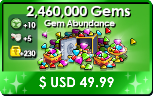 {{RecipeStore|Gem Abundance|49.99|USD|Get an abundance of gems to add to your wealth. Please note World Locks will be credited as 2 Diamond Lock and 30 World Locks. Please make sure you have room in your inventory to receive these items.}} | |||