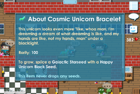 }}{{desc|This unicorn looks even more “Like, whoa man. I’m dreaming a dream of what dreaming is like, and my hands are like, not my hands, man” under a blacklight.}}The '''Cosmic Unicorn Bracelet '''was added at the Night of the Comet update on 29/11/2014.