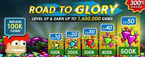 "Earn Gem rewards when you level up. Every 10 levels you will get additional Gem rewards up to Level 50! Claim all rewards instantly if you are over level 50!! 1.6M Gems in total!!"
