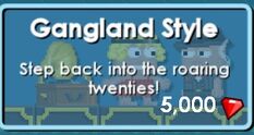 [[File:Gangster.jpg|thumb|left|233px|Gangland Style Store Button]][[File:Screenshot_2013-03-10-22-43-10.png|thumb|Full Suit Set.]]The | [[File:Gangster.jpg|thumb|left|233px|Gangland Style Store Button]][[File:Screenshot_2013-03-10-22-43-10.png|thumb|Full Suit Set.]]The first pack to come out in Growtopia, with the [[Fedora]] sponsored by i20HH. It costs 5,000 [[Gems |gems and]] is purchase-able from the [[Growtopia Store]]. | ||