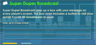 A Super Broadcast is done by doing /sb <message>, at a cost of 1 gem per 5 people. This will send your message to ALL online Growtopians. BEWARE! Game Moderators ARE WATCHING!!!