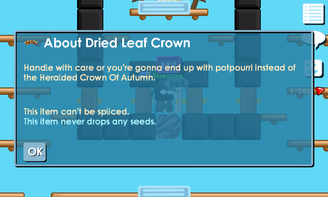 {{Desc|"Handle with care or you're gonna end up with potpourri instead of the Heralded Crown Of Autumn."}} | {{Desc|"Handle with care or you're gonna end up with potpourri instead of the Heralded Crown Of Autumn."}}Dried Leaf Crown is a head item that came with 2015 [[Harvest Festival]]. | ||