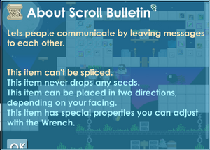 Stormburst (talk | contribs) This item can be obtained from Awkward Friendly Unicorn In Game Description:Lets people communicate by leaving messages to each other.This item can't be spliced.This item never drops any seeds.This item can be placed in two directions, depending o... |