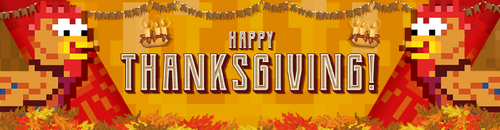 NOVEMBER 23rd: Happy Thanksgiving! Thanksgiving Week is here, and turkeytastic treasures await! Every day this week, you'll have a chance to get special seasonal clothes from breaking blocks - find them all for gobbly good costume! We're running a super cool challenge for builders too: Create the best Thanksgiving-themed world you can imagine and participate in our World Art contest to get an exclusive trophy, designed especially for this competition. Head to the Growtopia Forum and Instagram to find out more!