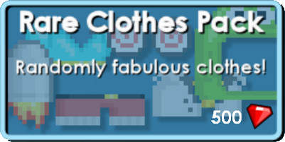 The Rare Clothes Pack is an item pack. It includes 3 randomly chosen clothing items that range from rarities 11 to 60.