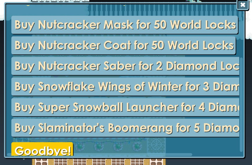 | https://cdn.growtopiawiki.com/uploads/8/8f/ItemSprites.png Nutcracker Saber | 2 Diamond Locks. |