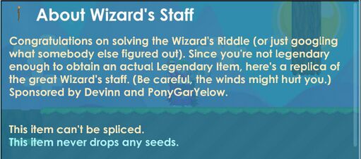 | Congratulations on solving the Wizard's Riddle (or just googling what somebody else figured out). Since you're not legendary enough to obtain an actual Legendary Item, here's a replica of the great Wizard's Staff. (Be careful, the winds might hurt you.) Sponsored by Devinn and PonyGarYelow. |