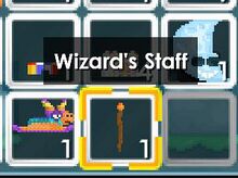 | https://cdn.growtopiawiki.com/uploads/8/8f/ItemSprites.png Wizard's Staff (×1), |
