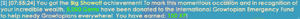 A special message with an unknown purpose is displayed when a player earns the achievement after the prize change, stating that "To mark this momentous occasion and in recognition of your incredible wealth, 5,000 Gems have been donated to the International Growtopian Emergency Fund to help needy Growtopians everywhere!"